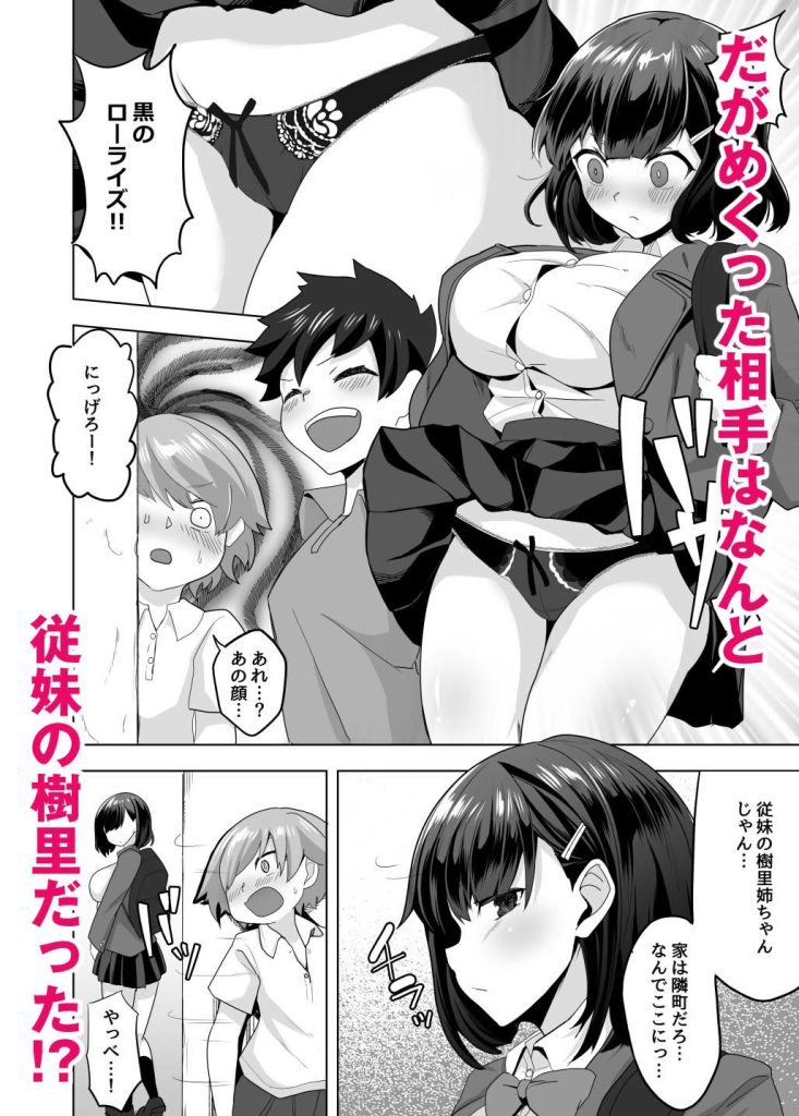 だがめくった相手は、なんと従妹の樹里だった。https://doujin-assets.dmm.co.jp/digital/comic/d_213583/d_213583jp-001.jpg慌てて隠れながら逃げるが…
